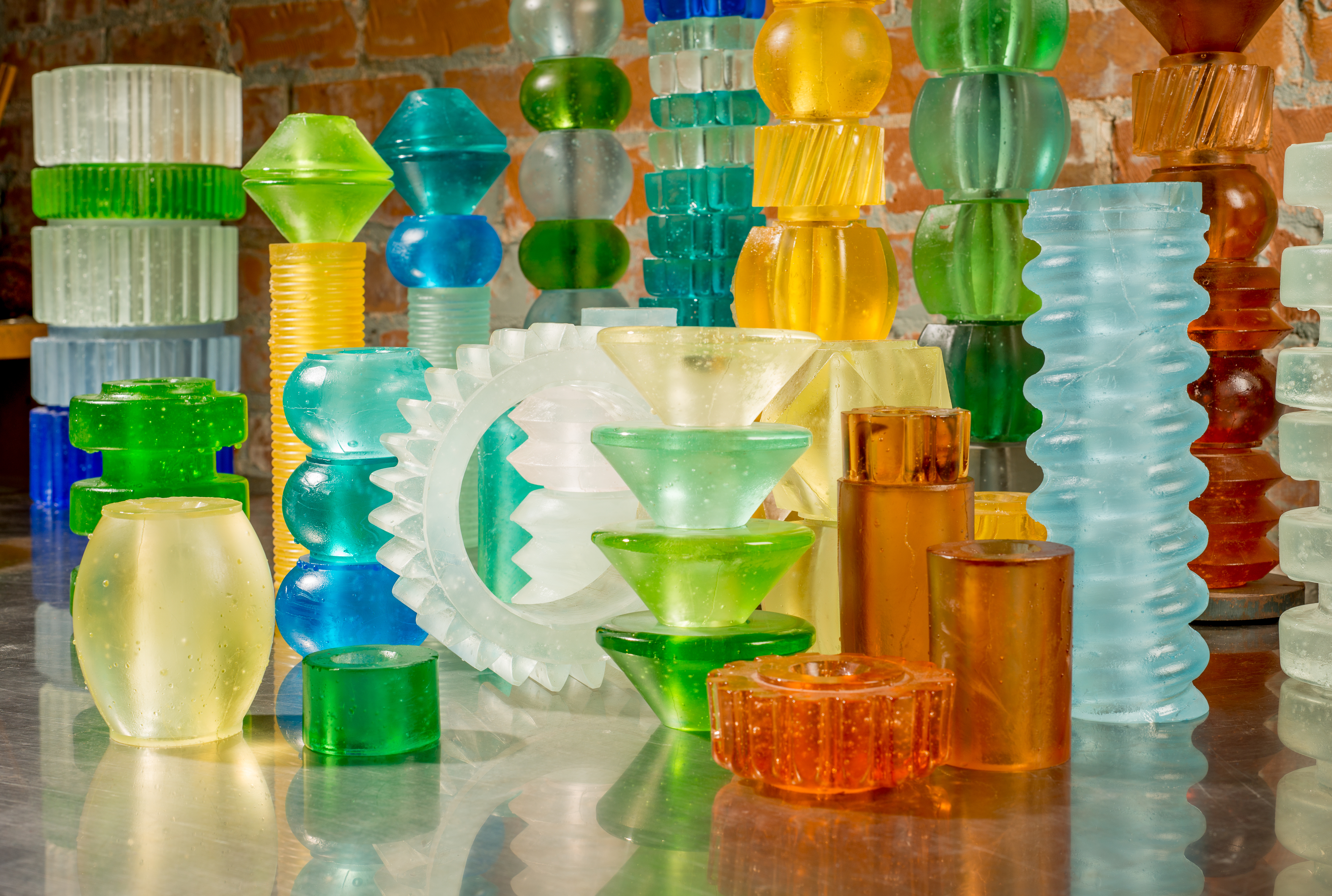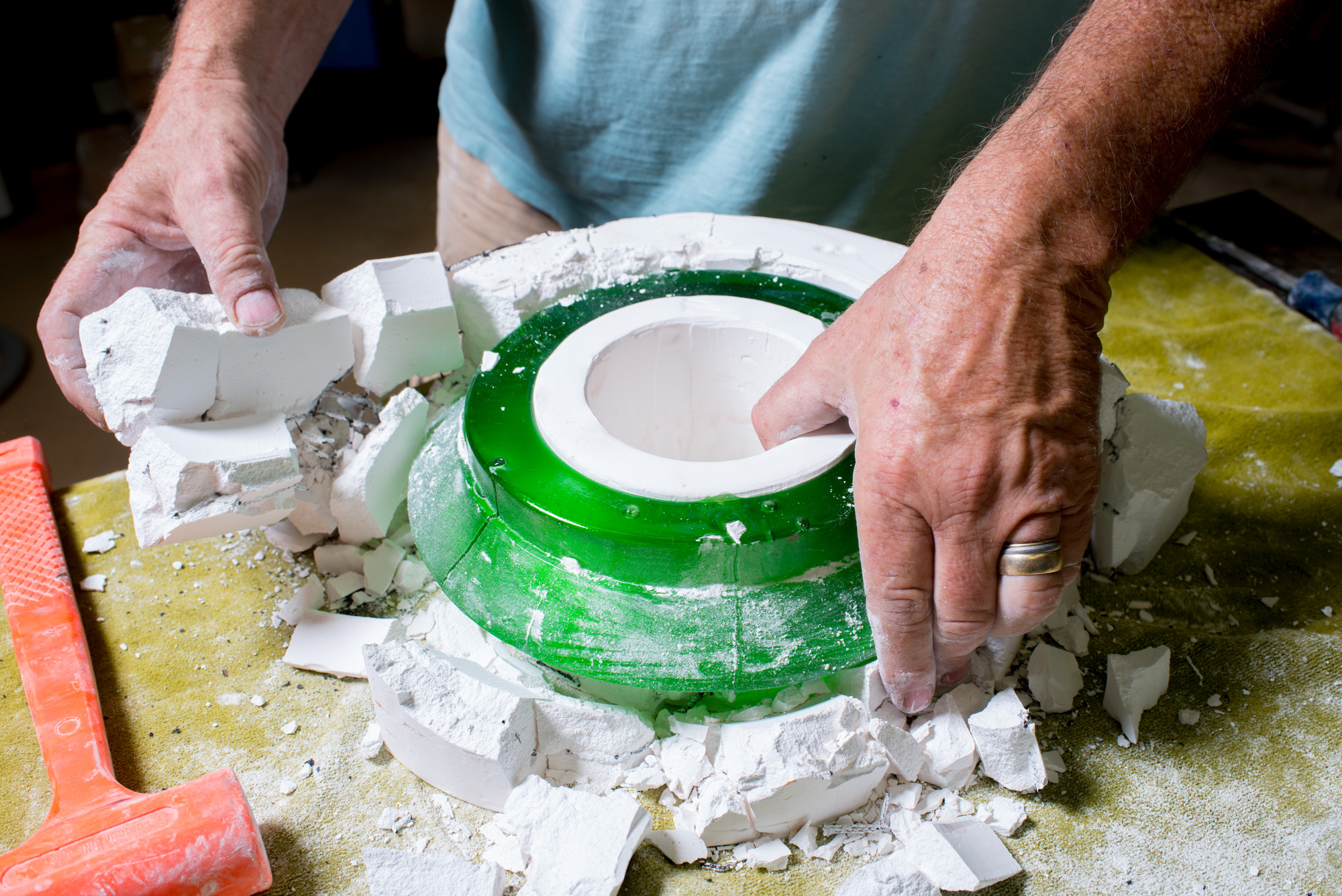 Lost wax casting is a versatile method for the creation of glass objects. The process begins with constructing a rubber mold around an item. Once the mold is finished, the item is removed and molten wax is poured into the mold cavity. The wax is allowed to cool and then removed. The wax model is an exact duplicate of the original item. A plaster/silica mold able to withstand high heat is created around the wax mold. the wax is steamed out of the mold - or "lost" - creating a negative of the original item. The mold is placed into a kiln where a crucible containing a measured quantity of glass is placed on top of the mold and the kiln temperature is raised to approximately 1400 °F. The glass melts and flows through a hole in the bottom of the crucible filling the negative space in the mold. Once the mold is filled with the molten glass the kiln is slowly cooled to room temperature or "annealed". The length of time to cool the casting is dependent on the thickness of the glass casting and can take days or even weeks to cool. After removing the mold from the kiln the plaster/silica mold is carefully removed from the glass casting. The glass item can now be worked on to finish its surface. Any number of finished glass castings can be assembled into sculptural objects.