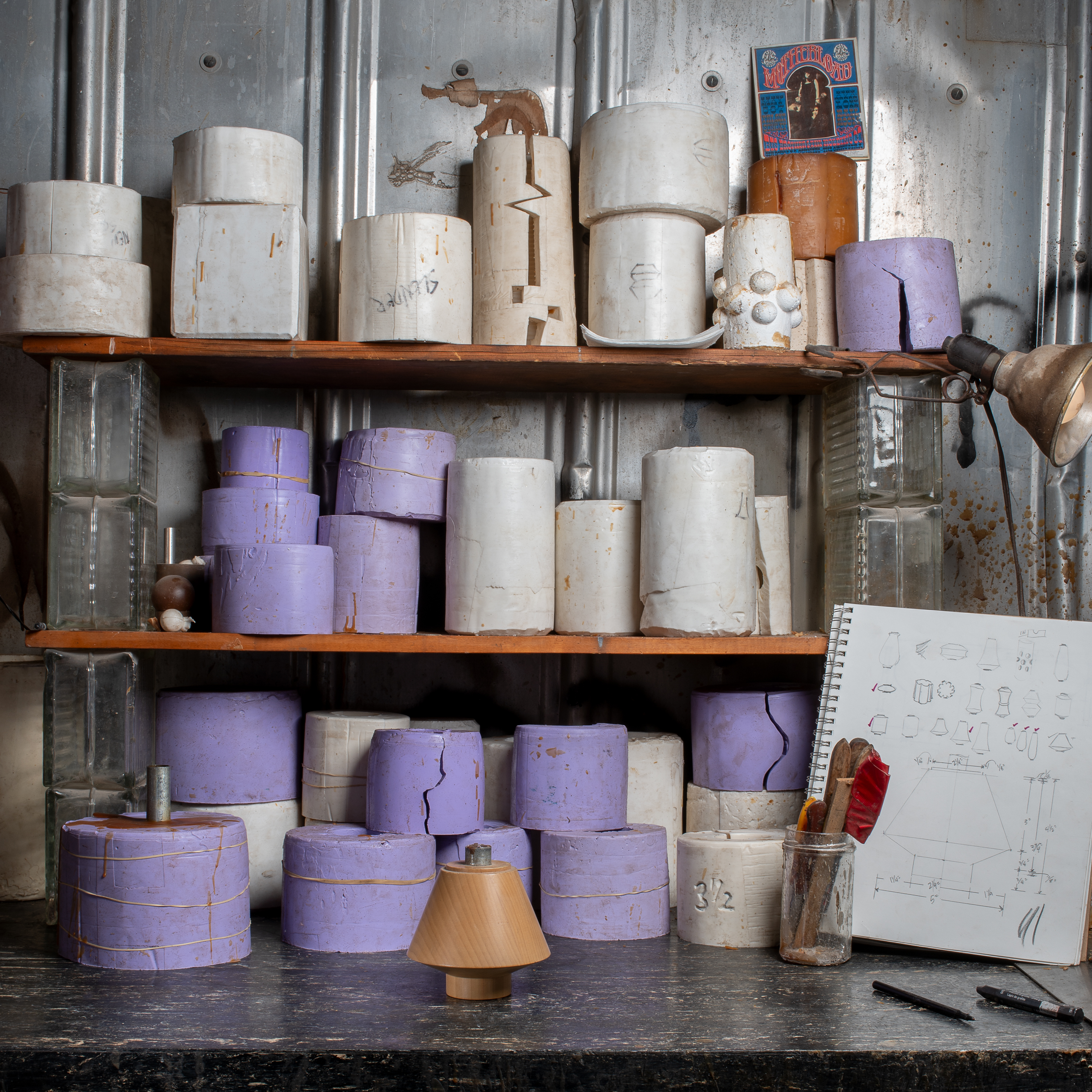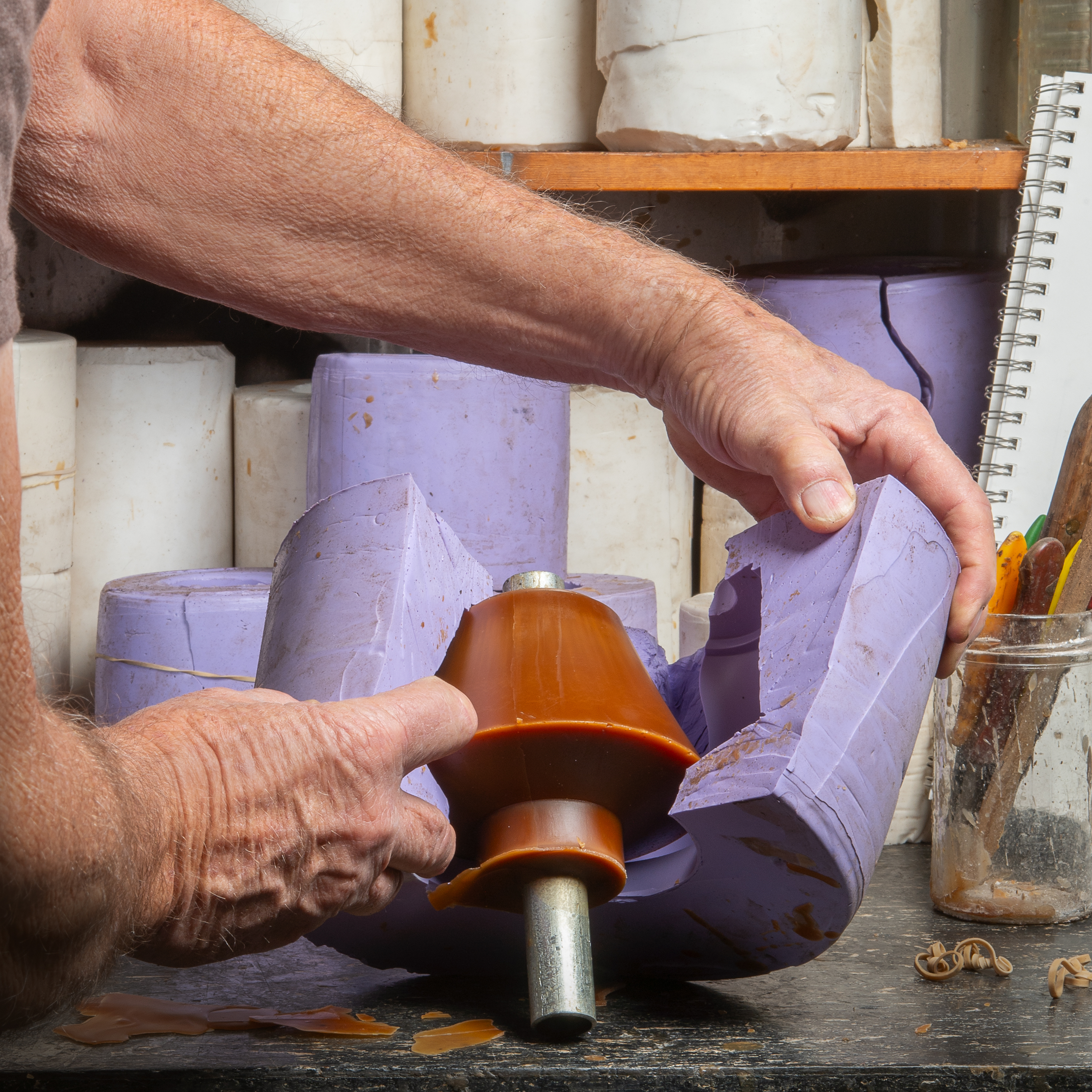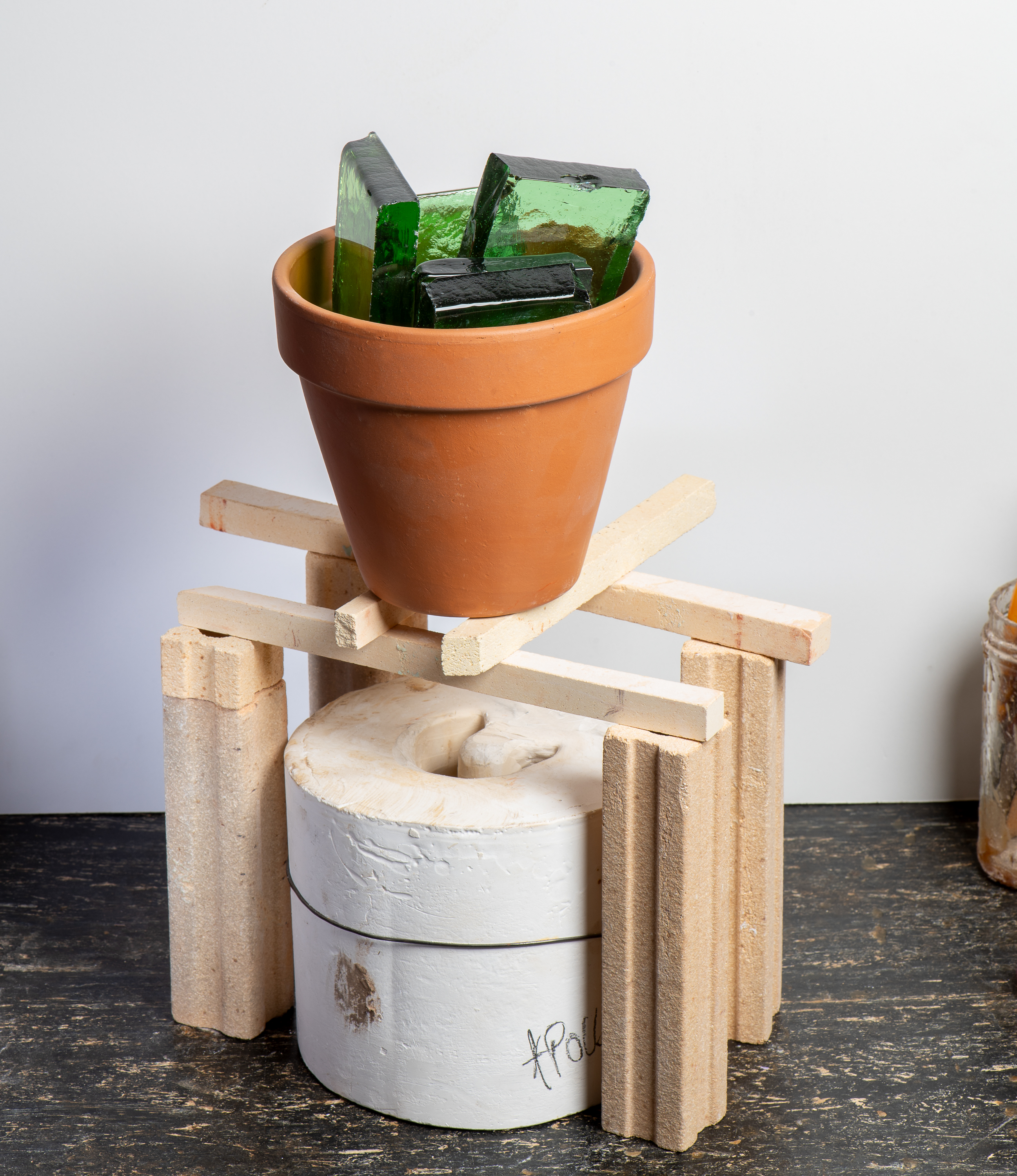 7. Terra-cotta flower pot crucible on kiln furniture bridge over plaster mold