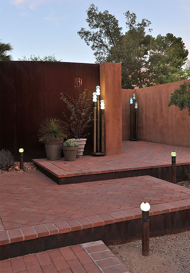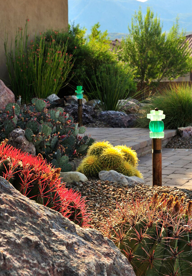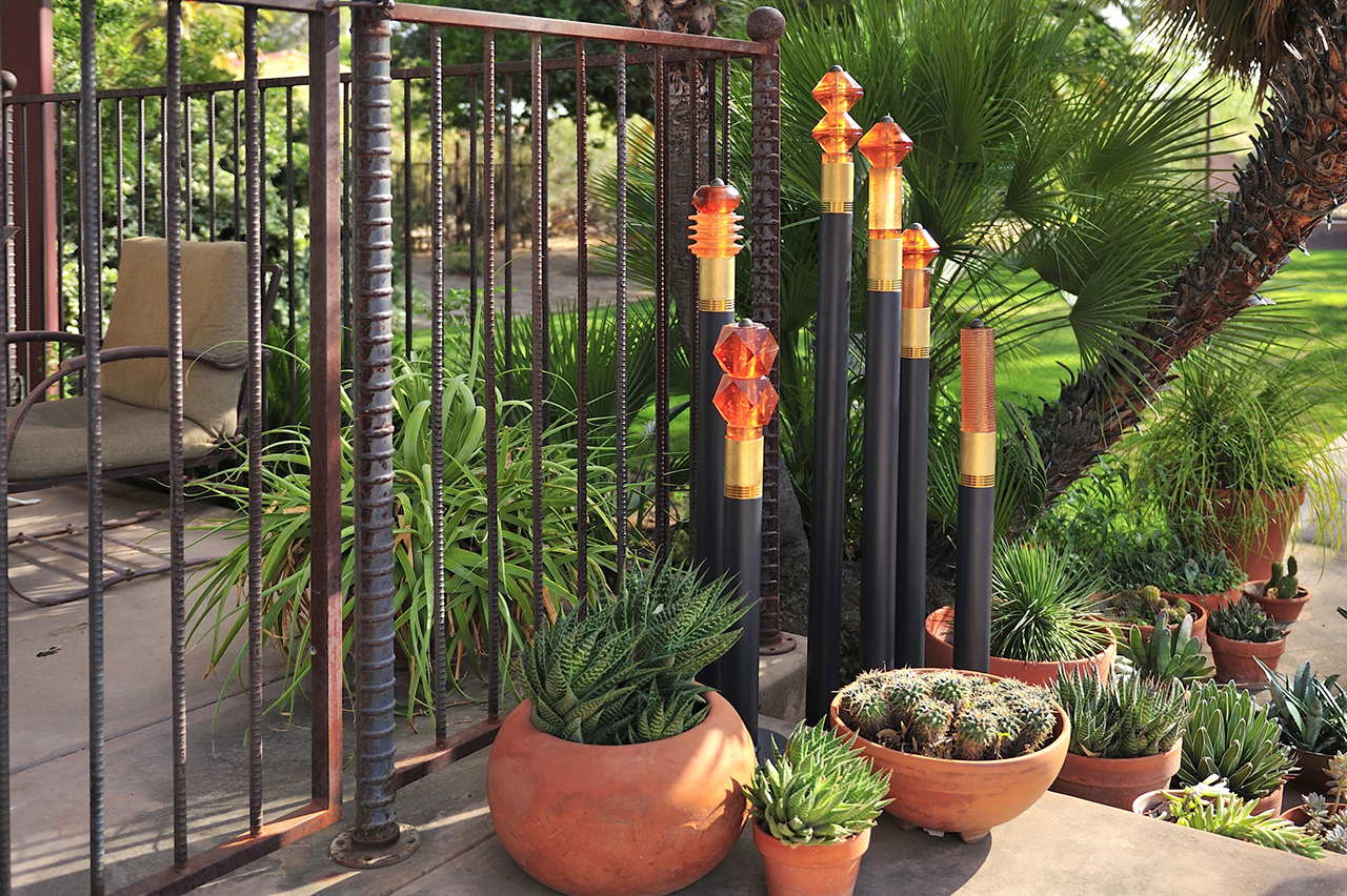 Reflecting style by day, illuminating nature by night. Cast glass beads sit atop a 9 array LED fixture, developed by Holm Architectural and Landscape Lighting, for Design Collaborations. This fixture combines first-class LED technology with premium materials. The fixture is installed in 2½-inch steel Tubing. The total height of the fixture is up to you. They function as pathway lighting, or serve as purely aesthetic enhancements.
