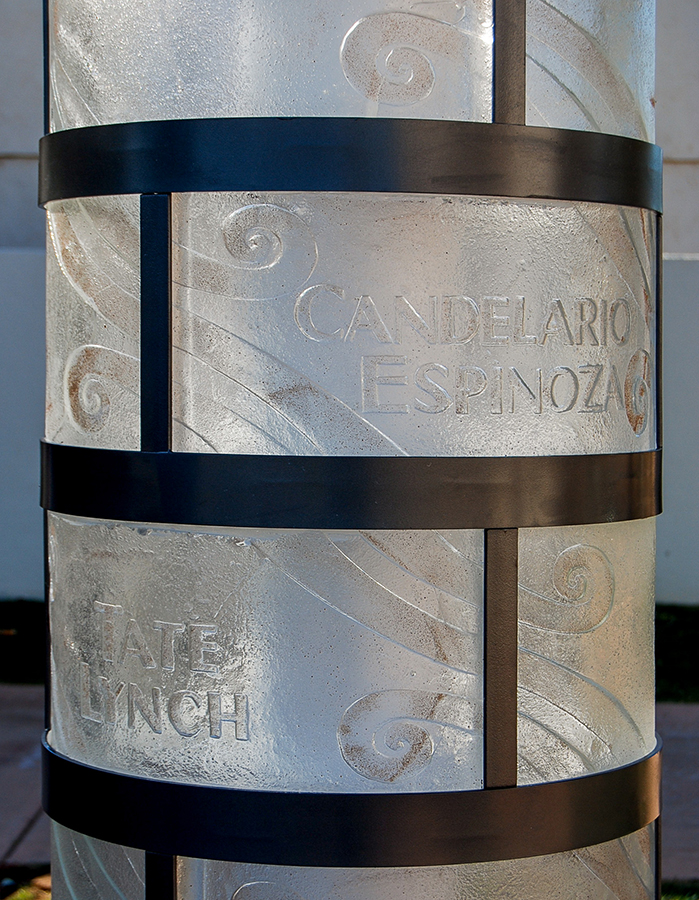 Particulars: A 7' high column, 18" in diameter, holds (15) cast glass plaques. Each Plaque is 19" L x 9"H x 1-1/4" thick, with names cast into the glass. Includes a solar powered light for evening illumination. Steel structure powder painted, column sits in 36' diameter plaza. Includes footers for three future column sites.