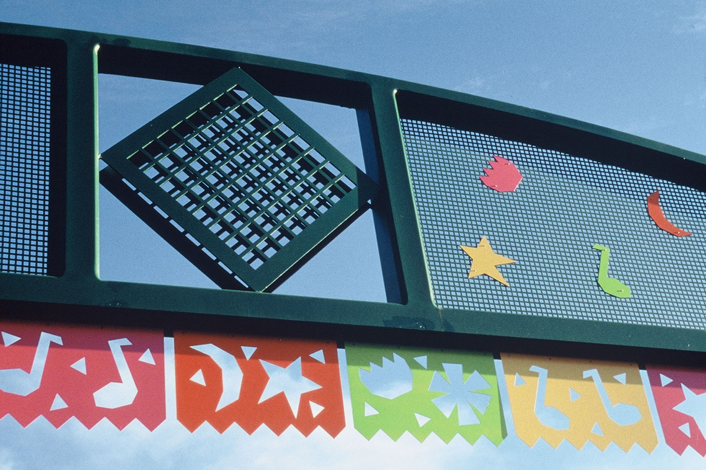 Particulars: Brightly painted, hinged metal flags hang from the steel structure 25' W x 14' H. (15) Picado flags in four colors have three different plasma cut images. Positive images from the cut flags were pop-riveted onto the top portion of the steel structure.