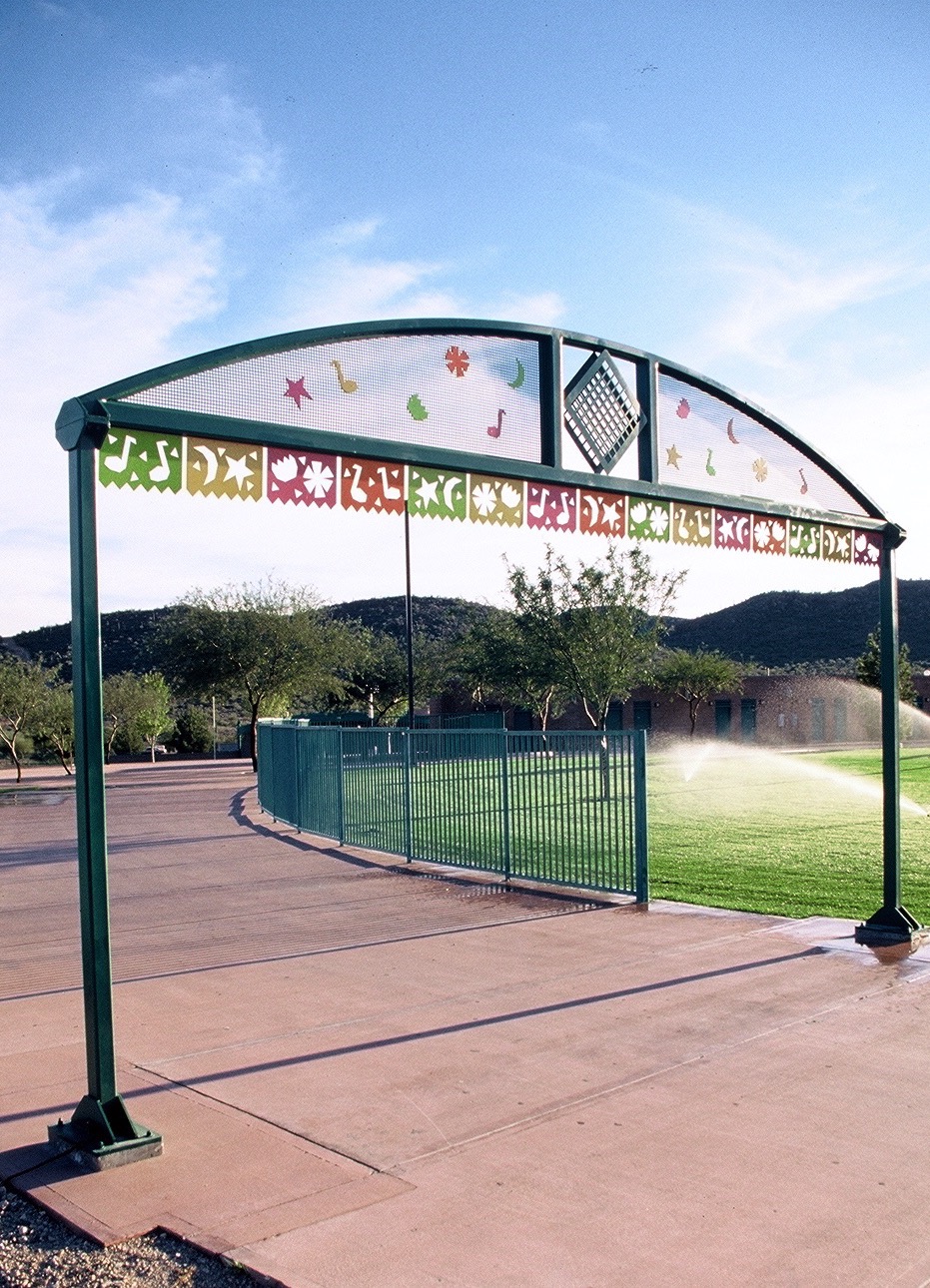 The Story: Completed in collaboration with the City of Tucson Parks and Recreation Department, and graphic artist Karen Piovaty. Design celebrates the culture of Tucson by enlarging the colorful flags known as papel picado, replacing the traditional wax paper with steel, and spanning across the walkway into Kennedy Park. Project Completed September of 1996.